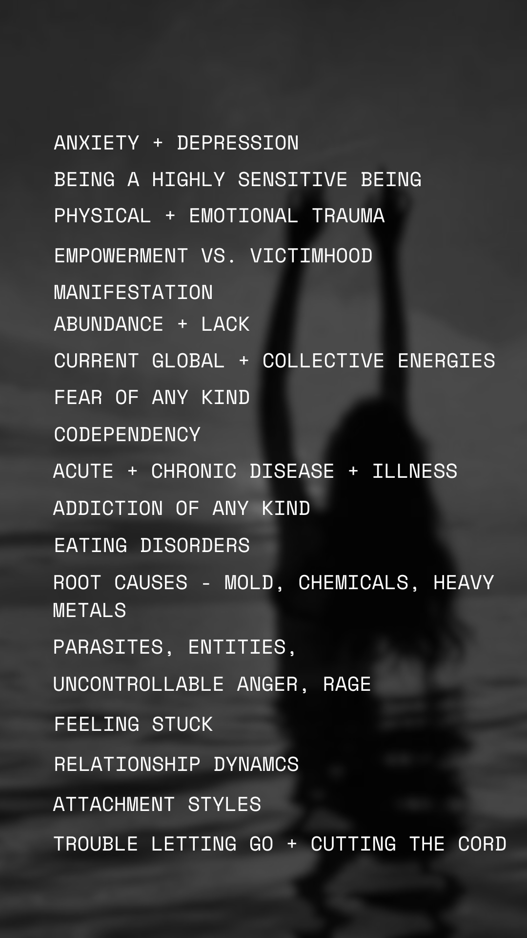 Here are some very common things I work with clients through everyday to get to the root cause of even though we can cover literally anything and everything, as grounded or as esoteric as you’d like! We’re very full spectrum around here, nothing is off limits. ;)