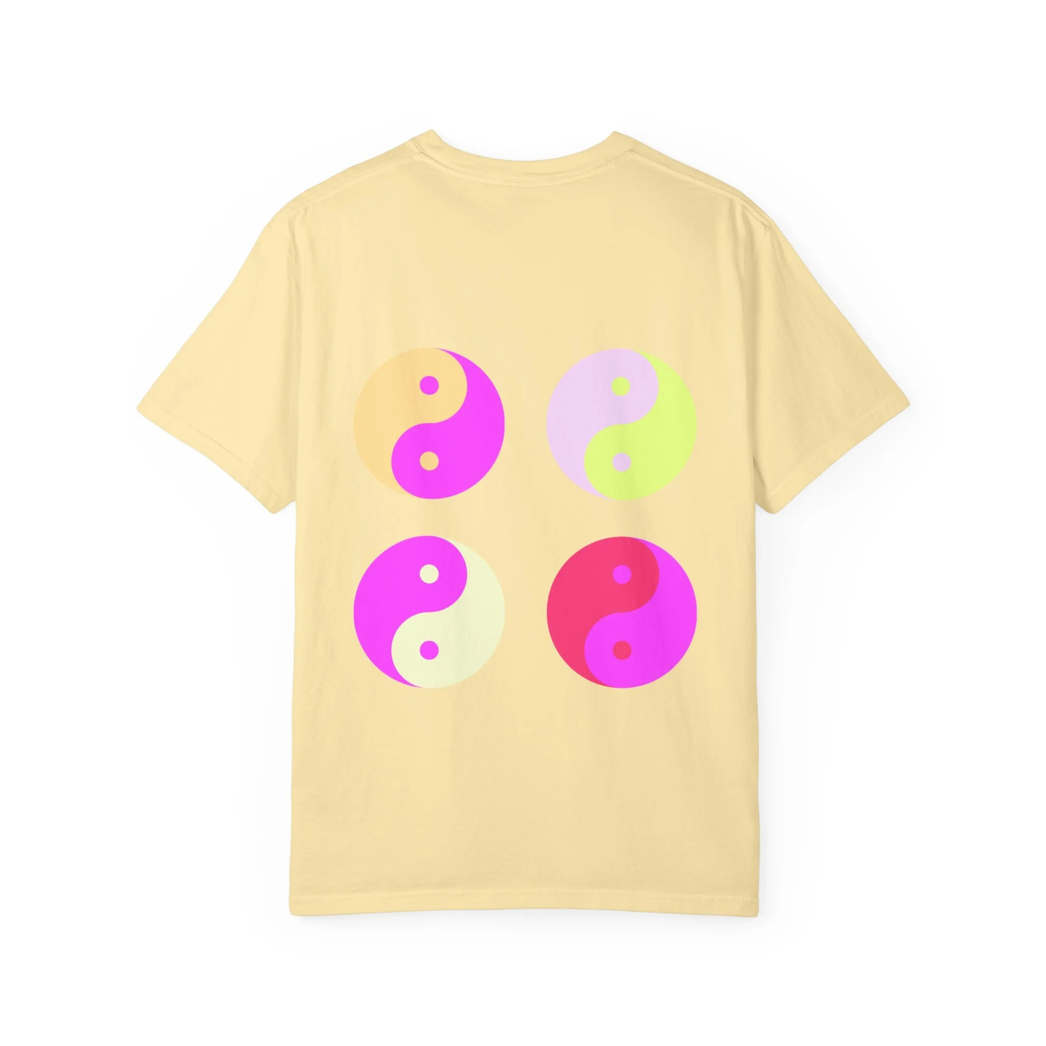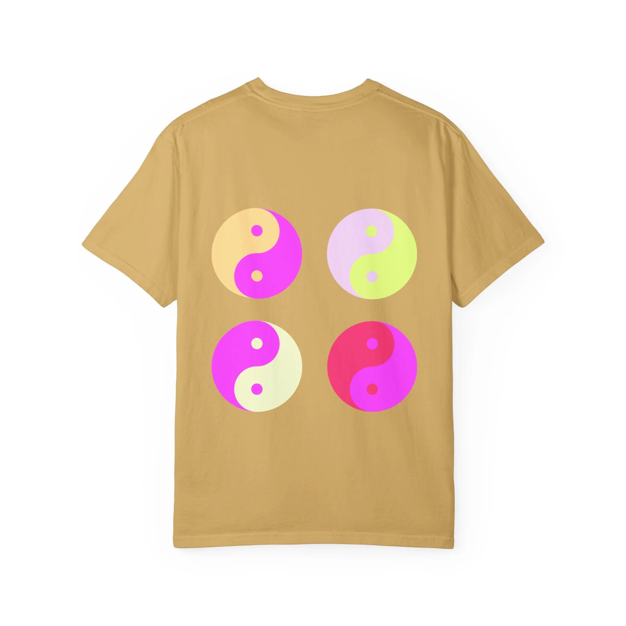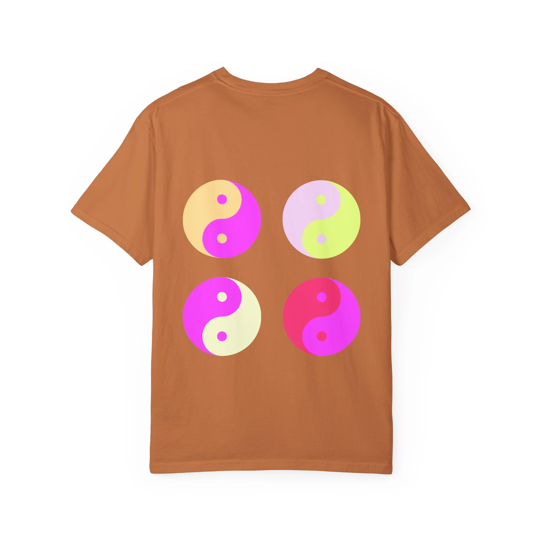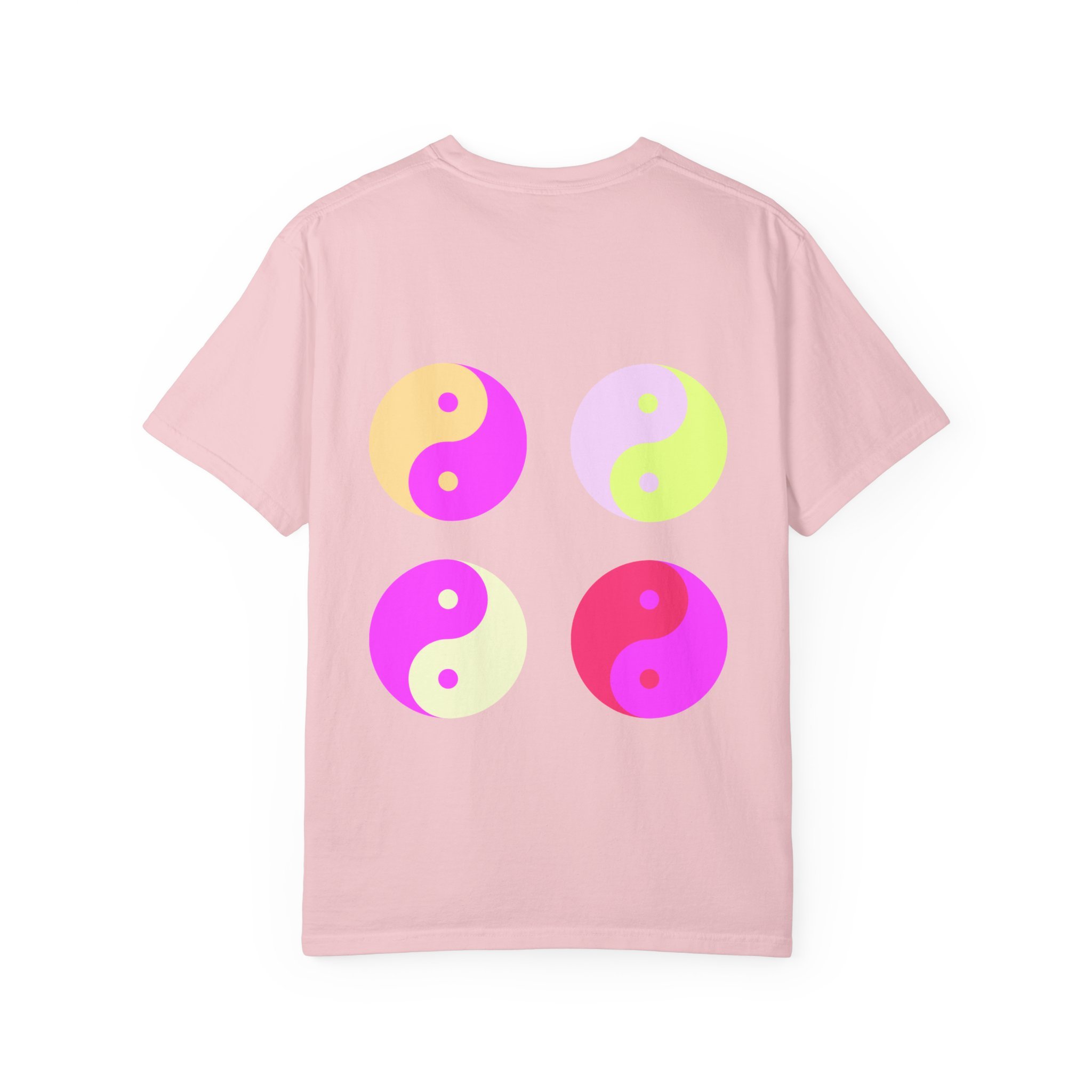 This relaxed, garment-dyed tee carries a confident, playful mood — softly worn fabric with bold, ironic messaging. The front reads “hot girls feel their feelings” in a vintage-inspired serif, while the back shows four neon yin-yang motifs in pop pinks and citrus tones. It feels like a late-night conversation with friends: sincere, a little cheeky, and fully comfortable in its own skin. Wear it to slow mornings with coffee, crowded gigs, or long walks where you’re both vulnerable and unbothered. The heavyweight cotton hangs just right and softens even more with each wash, so the shirt becomes part of your everyday rhythm instead of an afterthought.
