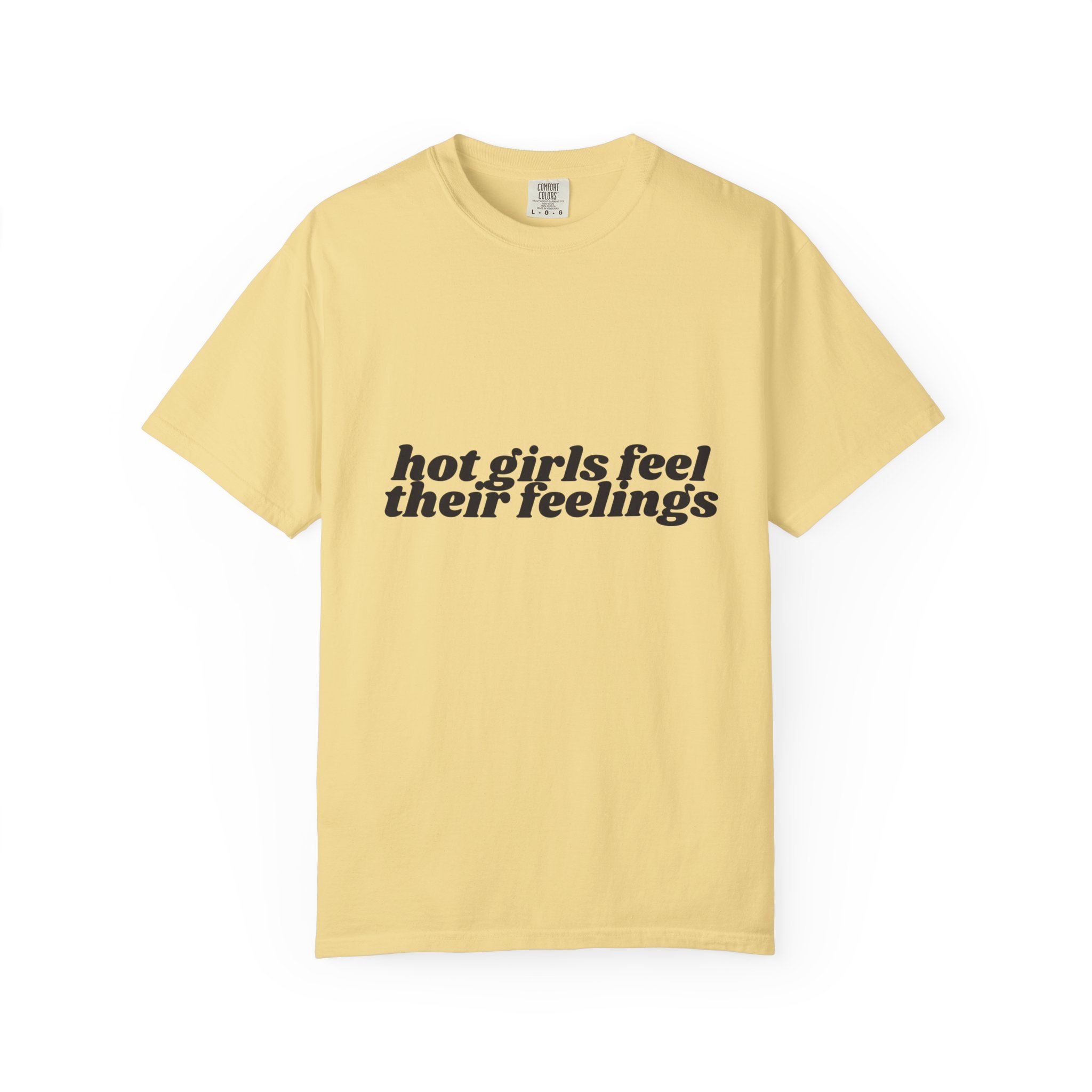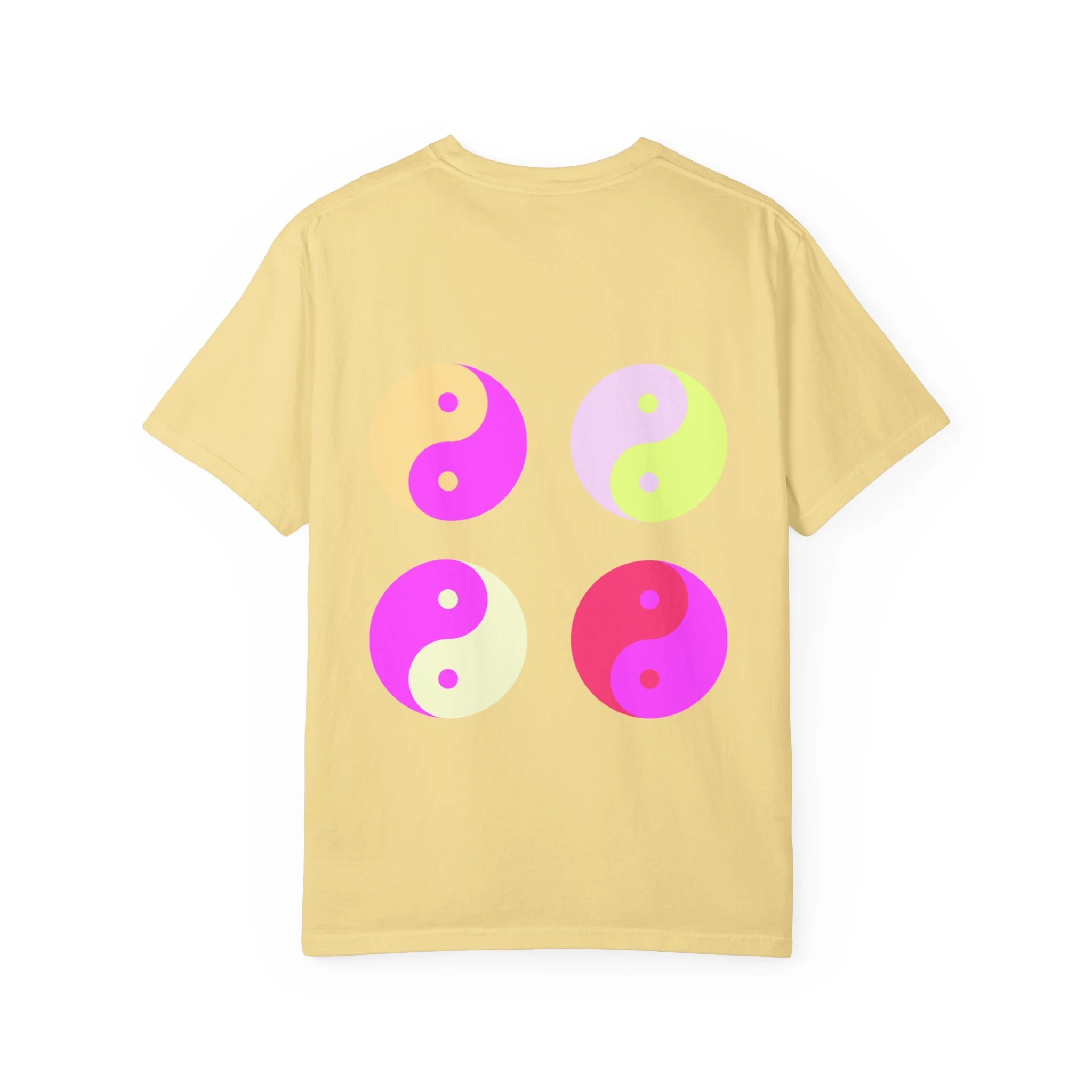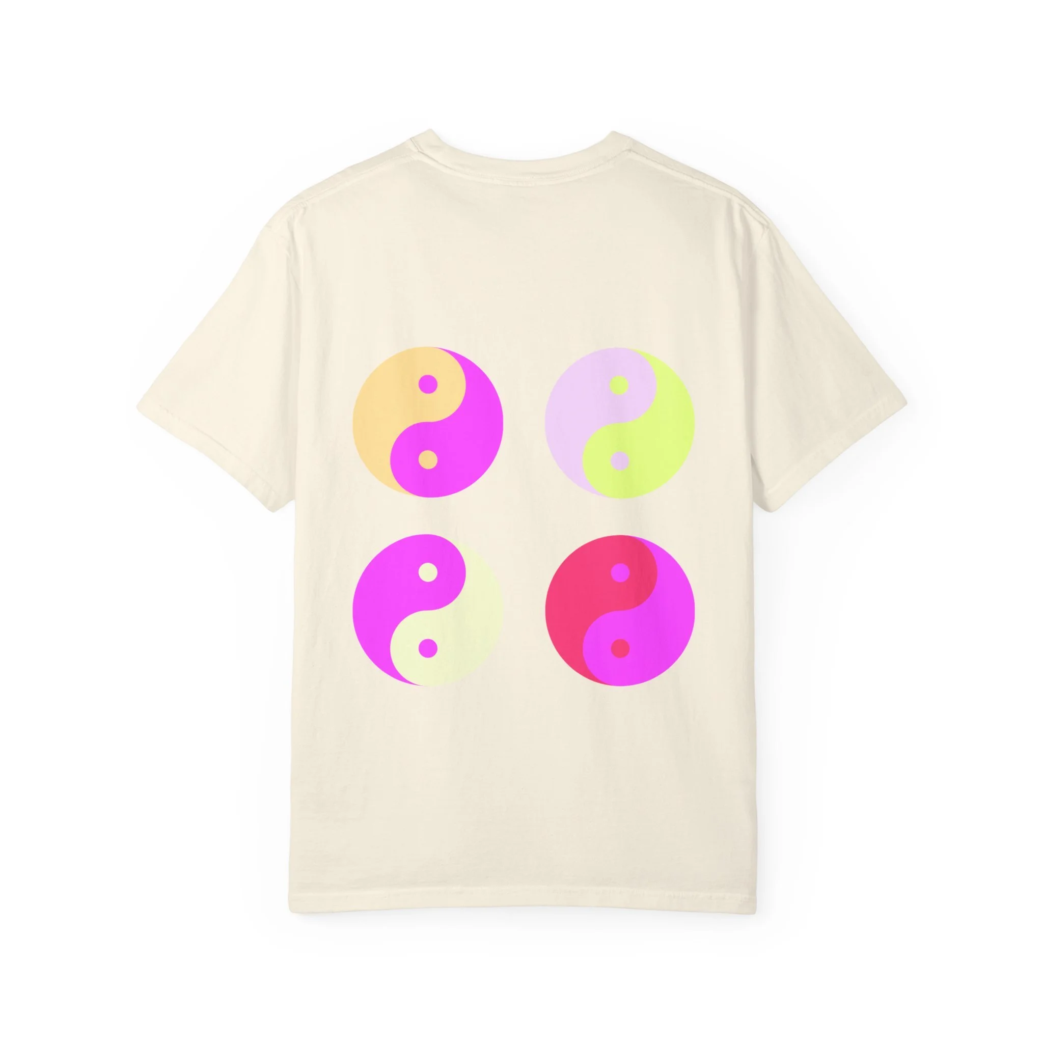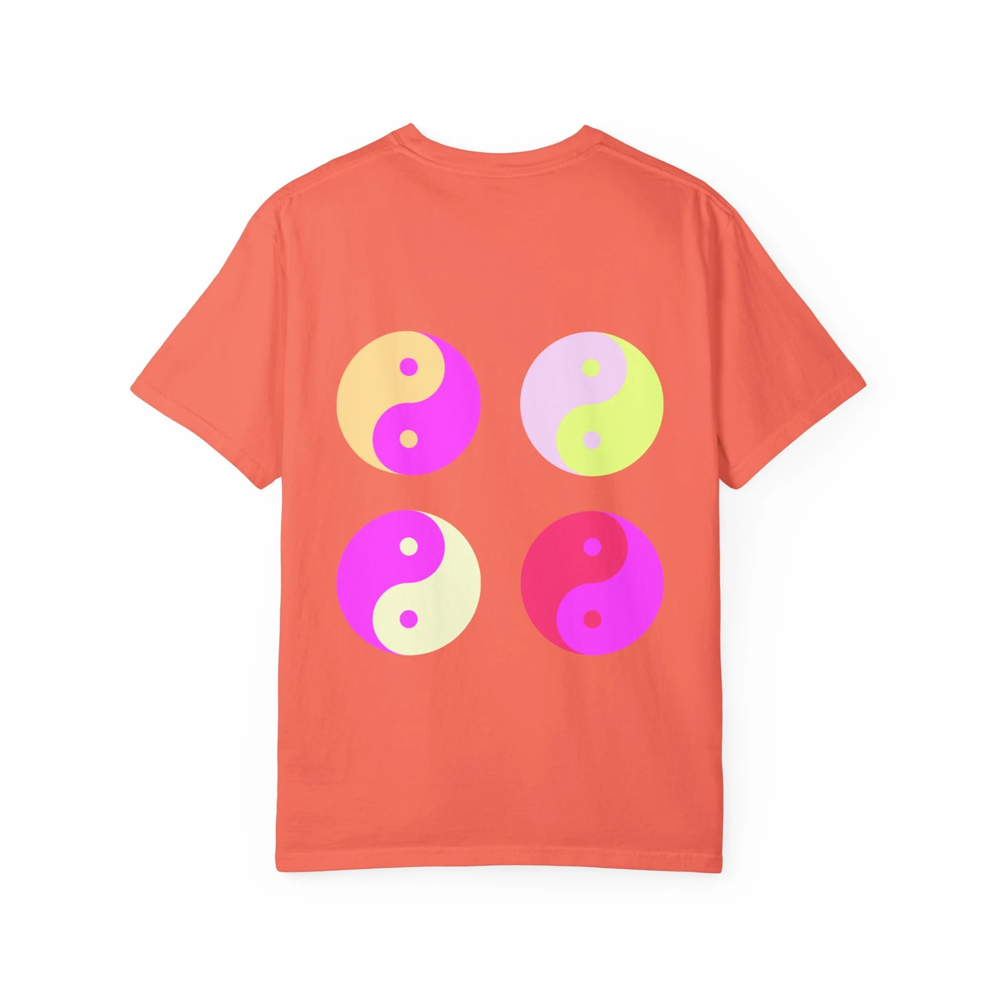 This relaxed, garment-dyed tee carries a confident, playful mood — softly worn fabric with bold, ironic messaging. The front reads “hot girls feel their feelings” in a vintage-inspired serif, while the back shows four neon yin-yang motifs in pop pinks and citrus tones. It feels like a late-night conversation with friends: sincere, a little cheeky, and fully comfortable in its own skin. Wear it to slow mornings with coffee, crowded gigs, or long walks where you’re both vulnerable and unbothered. The heavyweight cotton hangs just right and softens even more with each wash, so the shirt becomes part of your everyday rhythm instead of an afterthought.